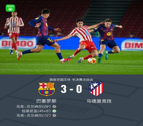 北京時間3月4日西班牙國王杯 半決賽次回合,巴塞羅那對陣馬德里競技。巴塞羅那馬克-貝爾納爾梅開二度,拉菲尼亞...