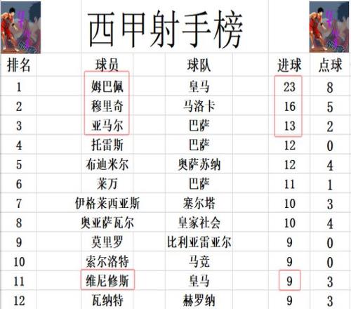 射手榜方面,傷缺的姆巴佩還是23球領(lǐng)跑,穆里奇16球排在第2,亞馬爾13球第3,托雷斯,布迪米爾12球并列第4。維尼修斯今天錯失超級單刀,還是和莫里羅,索爾洛特,瓦納特9球剛好擠入前十。
