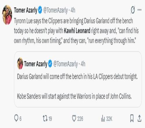 這場比賽之前泰倫盧表示,快船的新援加蘭會從替補席出發(fā),他不會一出場就與倫納德搭檔,泰倫盧希望加蘭能夠在第二陣容掌控節(jié)奏與時機,希望加蘭通過組織進攻來幫助球隊。