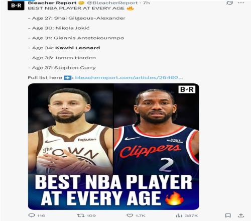 美媒BR也力挺現(xiàn)役最強34歲的球星是倫納德,現(xiàn)役最強37歲的球星是庫里而非杜蘭特。