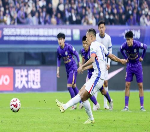 ↑2025年11月22日,上海申花隊(duì)球員吳曦(前)在中超第30輪點(diǎn)球破門。新華社記者 孫凡越 攝