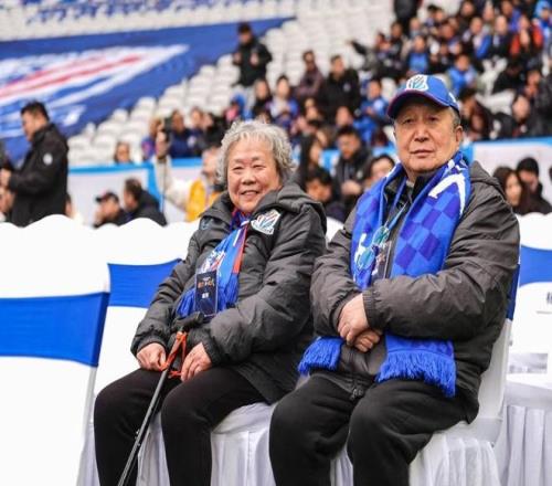 申花吉祥球迷會78歲的老會員張智敏(右)