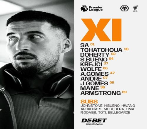狼隊(duì)首發(fā):1-若澤-薩、38-查舒亞、2-多爾蒂、4-圣地亞哥-布埃諾、37-拉迪斯拉夫-克雷伊奇、6-戴維-沃爾費(fèi)、7-安德烈、8-若昂-戈麥斯、47-安熱爾-戈梅斯、36-馬特烏斯-馬內(nèi)、9-亞當(dāng)-阿姆斯特朗