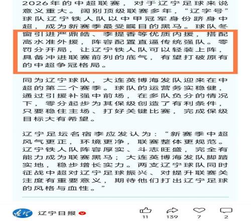 第二個(gè),這篇文章還提到了一個(gè)細(xì)節(jié),那就是介紹今年中超的爭冠格局是群雄逐鹿,專門提到了5支球隊(duì)名字,分別是海港、泰山、國安、成都蓉城和遼寧鐵人,再次認(rèn)可了遼寧鐵人的爭冠可能性。