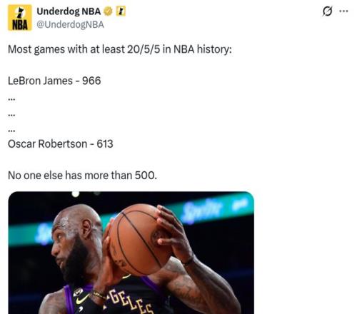 同時(shí)這是詹姆斯生涯第966場(chǎng)至少拿到20分5板5助,NBA歷史斷檔第一,大O以613場(chǎng)排在第二,兩人也是NBA歷史上唯二至少500場(chǎng)拿下20+5+5的球員。