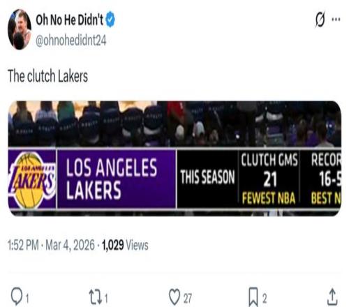 三人關(guān)鍵時(shí)刻夸張的能力也直觀展現(xiàn)在湖人隊(duì)?wèi)?zhàn)績(jī)方面,本場(chǎng)比賽拿下勝利后,湖人隊(duì)本賽季關(guān)鍵時(shí)刻(最后5分鐘分差5分以內(nèi))拿下17勝5負(fù)聯(lián)盟第一戰(zhàn)績(jī)。