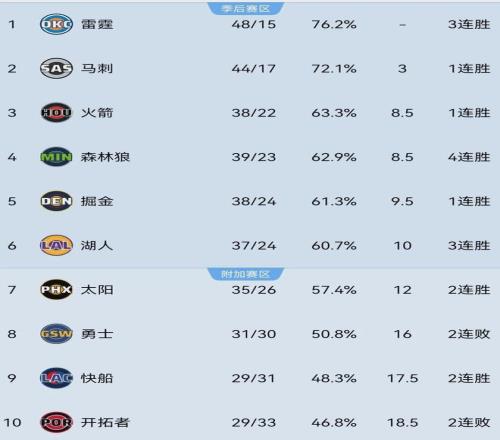 本賽季至今,森林狼以39勝23負位列西部第四,勝場數(shù)與第三的火箭(38-22)打平,僅領(lǐng)先第六的湖人(37-24)1.5個勝場。