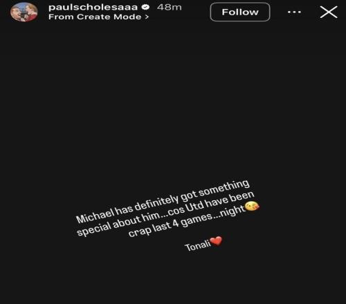 斯科爾斯在社交媒體發(fā)表動(dòng)態(tài),寫道:“邁克爾(卡里克)身上肯定有某種特別之處,因?yàn)槁?lián)最近四場(chǎng)比賽踢得簡直爛透了……晚安托納利??”