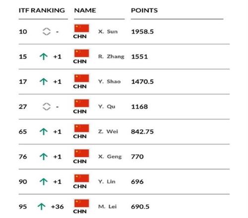 中國(guó)女網(wǎng)小花世界排名TOP200榜單:10.孫心然(2010年7月);15.張瑞恩(2008年4月);17.邵羽杉(2008年12月);27.渠依含(2009年3月);65.魏彰倩(2008年1月);76.耿心樂(lè)(2010年11月);90.林禹君(2010年6月);95.雷麥洛迪(2009年1月);131.吳汝茜(2008年8月);152.王小童(2009年6月);184.鄧沛恩(2008年2月)。