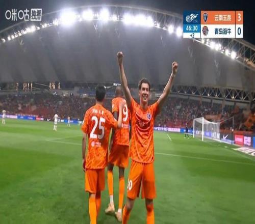 另外一場比賽中,云南玉昆坐鎮(zhèn)主場迎戰(zhàn)青島海牛。上半場第13分鐘,楊梓豪助攻克萊伯攻入加盟首球,云南玉昆1-0打破僵局。僅3分鐘之后,弋騰頭球沖頂破門擴大比分。補時階段侯永永單刀打門再度得手,云南玉昆半場3-0領先。