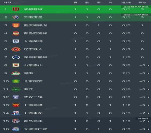 中超第1輪結(jié)束了6場(chǎng)比賽,最新積分榜如下!