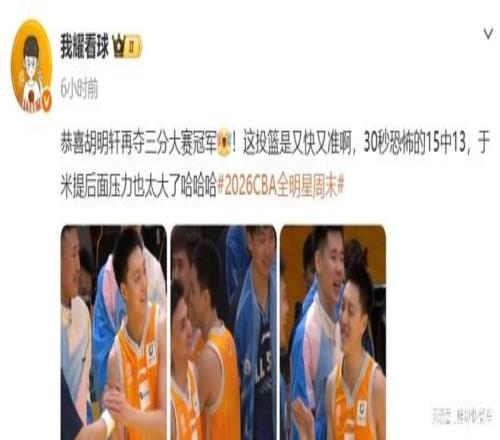 這一次CBA全明星三分大賽,胡明軒的狀態(tài)一直都非常不錯。預(yù)賽階段,他便投出了21分的不錯分值。而在決賽階段,作為第一個登場的球員,胡明軒的壓力雖然比較大,不過,他還是頂住壓力,成功投出了22分的高分。盡管于米提在隨后也壓哨絕殺,成功投出22分的高分。不過,在隨后的加時階段,胡明軒再度爆發(fā),在短短30秒內(nèi),瘋狂出手15次,命中13球,幾乎完美的數(shù)據(jù),輕松奪冠。