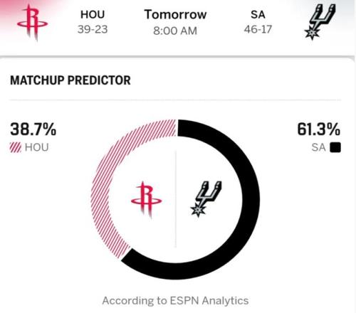 火箭雖在上場勝開拓者時,解鎖阿門與申京拆分使用、謝潑德打組織的高效戰(zhàn)術(shù),但烏度卡此役延續(xù)常規(guī)首發(fā),史密斯、杜蘭特、申京、伊森、阿門,陣容兼容問題再度備受考驗。烏度卡如何調(diào)整去削弱文班的壓制力,成為火箭取勝關(guān)鍵,整體來看馬刺實力更占優(yōu)。賽前,ESPN勝率預(yù)測:火箭贏球概率低至38.7%,馬刺贏球概率則到達61.3%!