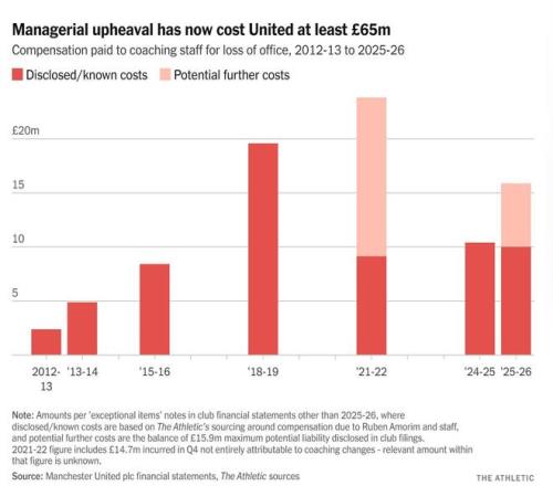 對(duì)財(cái)務(wù)狀況而言,或許更重要的是繼續(xù)聘用以及——這在足球界很可能發(fā)生,尤其是在近期的曼聯(lián)——最終解雇卡里克需要花費(fèi)多少。就像球員薪水一樣,主教練的薪水從未可靠地公開(kāi)過(guò),但可以合理地認(rèn)為,如果他留在老特拉福德教練席,俱樂(lè)部花費(fèi)會(huì)比聘請(qǐng)一位更受追捧、名氣更大的人物要少。相應(yīng)地,如果事情進(jìn)展不順,解雇他的成本也會(huì)更低。一月初解雇阿莫林及其教練組,使曼聯(lián)面臨最高1590萬(wàn)英鎊的和解賠償金,這與近年來(lái)一系列類(lèi)似的支出相當(dāng)。解雇滕哈格花費(fèi)了1040萬(wàn)英鎊;三年前解雇索爾斯克亞花費(fèi)了910萬(wàn)英鎊;2018年12月解雇若澤-穆里尼奧花費(fèi)了1960萬(wàn)英鎊——這是俱樂(lè)部歷史上支付給主教練的最高和解金。