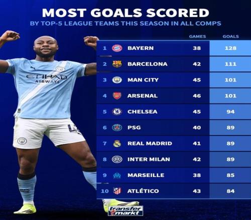 本賽季五大聯(lián)賽球隊(duì)進(jìn)球榜:拜仁128球第1,巴薩第2,曼城第3