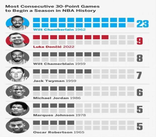 另外張伯倫還曾開季連續(xù)23場(chǎng)比賽砍下30+,最接近的人是盧卡·東契奇,他連續(xù)做到過(guò)9場(chǎng)。