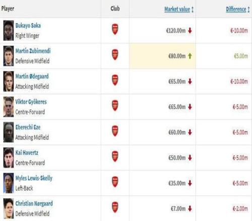 阿森納球員身價(jià)變化: