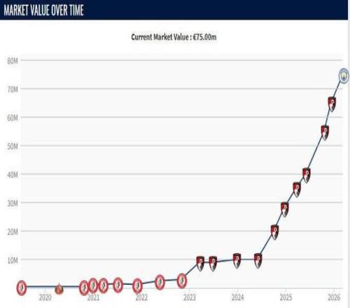 2024年5月時(shí)他的身價(jià)為1000萬(wàn)歐元,同年10月上漲至2000萬(wàn)歐元,12月,他的身價(jià)上漲800萬(wàn)歐元,達(dá)到2800萬(wàn)歐元,之后分別上漲至3500萬(wàn)歐、4000萬(wàn)歐、5500萬(wàn)歐和6500萬(wàn)歐。