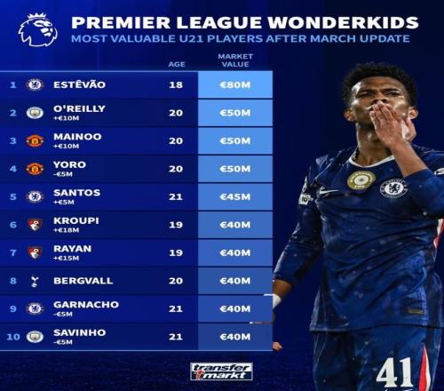 英超U21身價前10:埃斯特韋8000萬第1,奧賴利、梅努、約羅第2