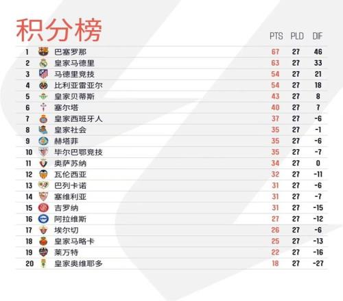北京時間3月10日凌晨,西班牙人主場1比1戰(zhàn)平皇家奧維耶多后,西甲第27輪十場比賽全部戰(zhàn)罷。積分榜方面,本輪“皇薩競”全部贏球:皇馬客場2比1擊敗塞爾塔,巴薩同為客場1比0擊敗畢爾巴鄂競技,馬競則是主場3比2力克皇家社會。目前,巴薩積67分繼續(xù)領跑,皇馬積63分排名第二,馬競積54分。比利亞雷亞爾同樣贏球,積分繼續(xù)與馬競持平,僅以凈勝球劣勢排名第四?;始邑惖偎箍拓摵账M,積43分位列歐聯(lián)區(qū),塞爾塔輸球積40分位列第六。