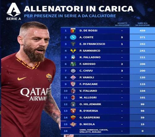 北京時間3月10日,德轉(zhuǎn)統(tǒng)計(jì)出了意甲20家俱樂部現(xiàn)任主帥球員生涯的意甲出場數(shù)排名,熱那亞主帥德羅西以459場排名第一,那不勒斯主帥孔蒂371場第二。