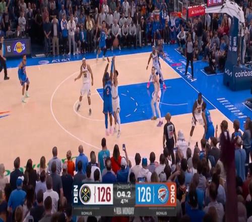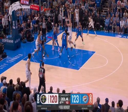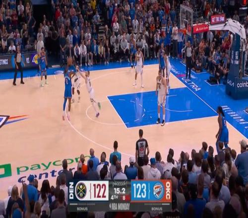 ——雷霆最后一攻,亞歷山大接球單挑瓊斯,投進(jìn)絕殺三分,沒有暫停的掘金后場(chǎng)孤注一擲的三分不進(jìn),雷霆拿下勝利