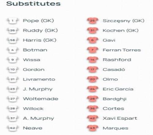 替補:6-加維、7-費蘭-托雷斯、14-拉什福德、17-卡薩多、20-奧爾莫、24-埃里克-加西亞、25-什琴斯尼、28-巴爾德吉、31-迭戈-科亨、36-科爾特斯、42-埃斯帕特、43-湯米-馬克斯