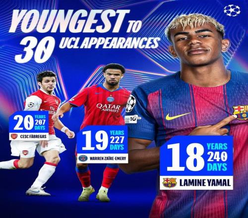 據(jù)統(tǒng)計(jì),18歲240天的亞馬爾成為歐冠聯(lián)賽歷史上出場(chǎng)次數(shù)達(dá)到30場(chǎng)最年輕的球員。