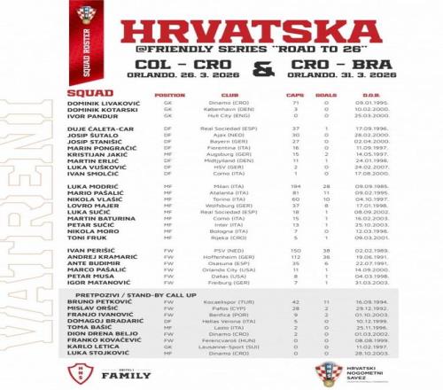 克羅地亞國(guó)家隊(duì)公布了3月份友誼賽的球員名單,他們將在友誼賽中對(duì)陣哥倫比亞和巴西?;蜀R傳奇莫德里奇領(lǐng)銜大名單,國(guó)際米蘭中場(chǎng)蘇西奇在列。格瓦迪奧爾和科瓦契奇因傷缺席本次集訓(xùn)機(jī)會(huì)的。這會(huì)是他們世界杯之前的重要訓(xùn)練機(jī)會(huì)。