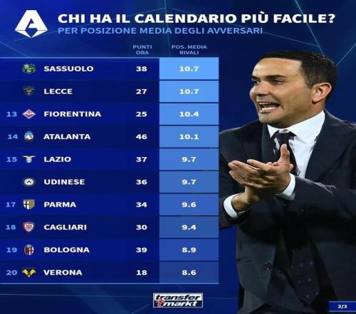 德轉(zhuǎn)統(tǒng)計本賽季意甲最后10輪各隊對手平均排名: