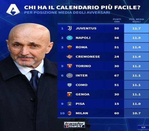 北京時間3月11日,德轉(zhuǎn)統(tǒng)計出了本賽季意甲剩余10輪各支球隊將會遭遇的對手在聯(lián)賽中的平均排名,其中尤文圖斯的最后10個對手目前平均排名第11.7位,為所有球隊最低。目前7分優(yōu)勢領(lǐng)跑積分榜的國際米蘭最后10輪對手的平均排名則為11.1位。