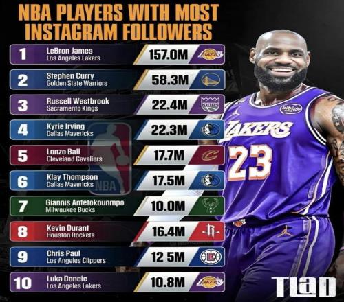 誰受歡迎不再有爭議NBA球員社媒粉絲數(shù)發(fā)布詹姆斯是庫里三倍