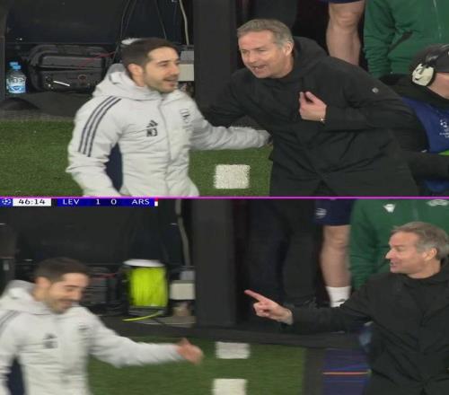 歐冠1/8決賽首回合,勒沃庫(kù)森主場(chǎng)對(duì)陣阿森納,在下半場(chǎng)勒沃庫(kù)森通過角球機(jī)會(huì)取得領(lǐng)先后,藥廠主帥尤爾曼德馬上找到阿森納定位球教練喬弗爾。