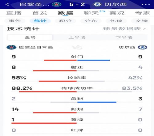 進攻大戰(zhàn)!巴黎52切爾西全場數(shù)據(jù):射門99,射正84