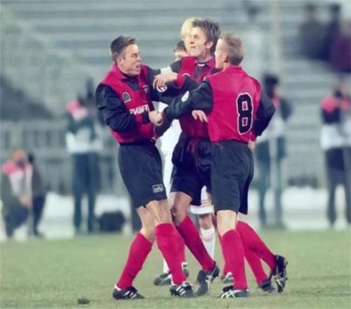 比賽中,他在一次爭搶頭球時(shí),不小心肘部打到了貝克漢姆的臉。小貝當(dāng)場血流不止,嘴里罵罵咧咧。