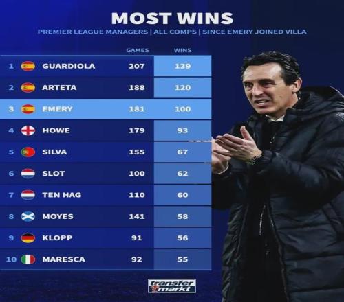 此役讓埃梅里執(zhí)教維拉勝場定格100場,僅用181場刷新隊史最快紀(jì)錄!英超主帥勝場榜:瓜迪奧拉139勝、阿爾特塔120勝,這位曾被阿森納解雇的西班牙教頭竟躋身歷史前三。百勝對手名單赫然包括拜仁、巴黎等歐冠豪門。維拉官推曬出百勝海報時,球迷淚目:“他讓維拉重拾1982年歐冠冠軍之魂!”從保級隊到歐戰(zhàn)勁旅,埃梅里用傳控紀(jì)律重塑基因:本賽季客場3-0南安普頓等戰(zhàn)役,印證“細節(jié)控”哲學(xué)。