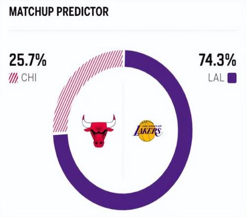 賽前,美媒ESPN對本場比賽進(jìn)行了勝率預(yù)測,湖人隊(duì)勝率高達(dá)74.3% ,公牛勝率則僅有25.7% ,劣勢明顯 。