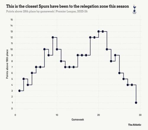 變化不小,但最引人注目的事件是,幾周來一直在降級(jí)區(qū)邊緣徘徊的熱刺,如今已正式加入了保級(jí)派對(duì)。他們是英超中唯一一支在2026年至今仍未嘗勝績(jī)的球隊(duì)。下圖清晰地展示了這一糟糕狀態(tài)如何讓他們深陷降級(jí)區(qū)泥潭。上周四1-3負(fù)于來訪的水晶宮意味著他們現(xiàn)在僅比排名第18位的西漢姆聯(lián)高出一分。