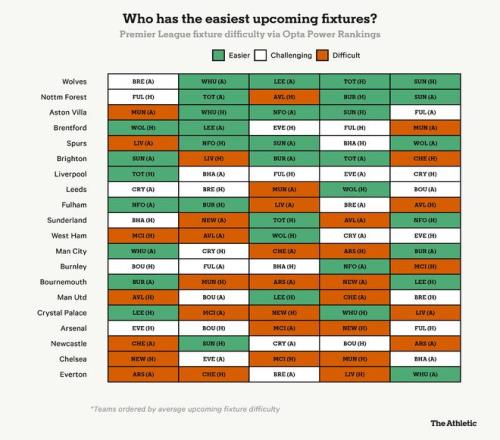 接連戰(zhàn)勝阿斯頓維拉和戲劇性地絕殺利物浦,英超墊底球隊(duì)在連續(xù)兩場(chǎng)比賽中擊敗了積分榜前六中的兩支球隊(duì),同時(shí)三周前還從領(lǐng)頭羊阿森納身上搶得一分。有趣的是,根據(jù)Opta的實(shí)力排名,主教練羅布-愛德華茲現(xiàn)在可以期待接下來最為輕松的賽程:從現(xiàn)在到五月初,他們將依次面對(duì)西漢姆聯(lián)、利茲聯(lián)和熱刺——三隊(duì)均在積分榜后六位——以及狀態(tài)不佳的桑德蘭。