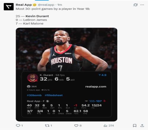 在生涯第18個(gè)賽季拿到25次30+的球員杜蘭特歷史第一,詹姆斯只有9次,卡爾馬龍只有7次。