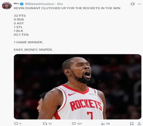 休媒:火箭隊(duì)球迷又看著37歲的杜蘭特拯救了球隊(duì),他再一次成為了救世主。