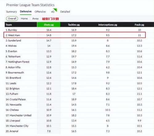 本賽季西漢姆聯(lián)在英超場均被射門次數(shù)達(dá)到14.8次,只比聯(lián)賽排名倒數(shù)第二的伯恩利少,比其他球隊都要多。相比之下,曼城場均被射門10.1次,排名英超第二少。