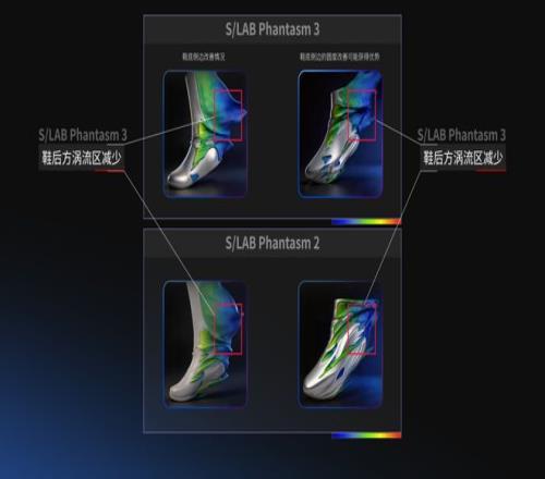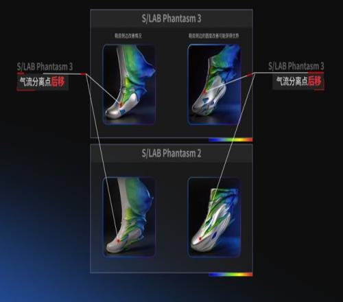 而在氣流形態(tài)的可視化畫面中可以看到,包裹腳踝的護罩結構確實起到了作用:氣流從鞋面流經(jīng)腳踝時,不再是突然分離形成渦流,而是更平滑地過渡過去。鞋身圓潤的輪廓也讓氣流分離點后移,從而減少了后端壓強產(chǎn)生的阻力。
