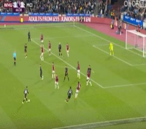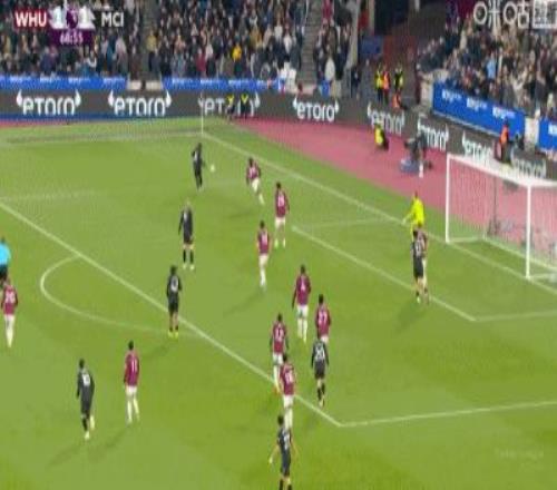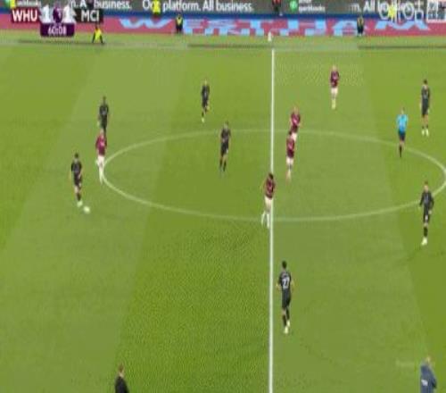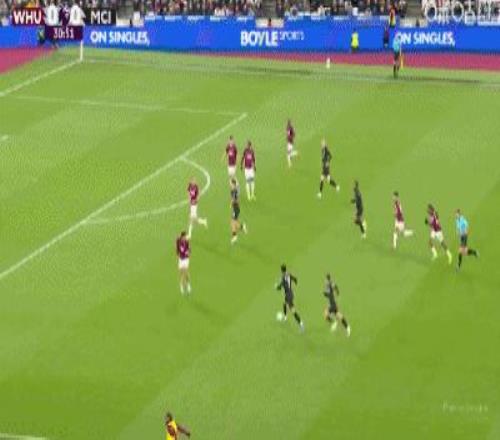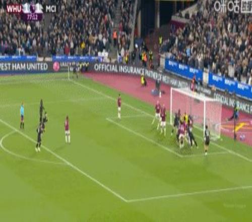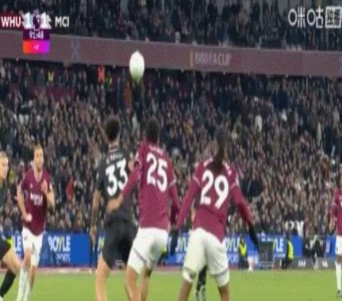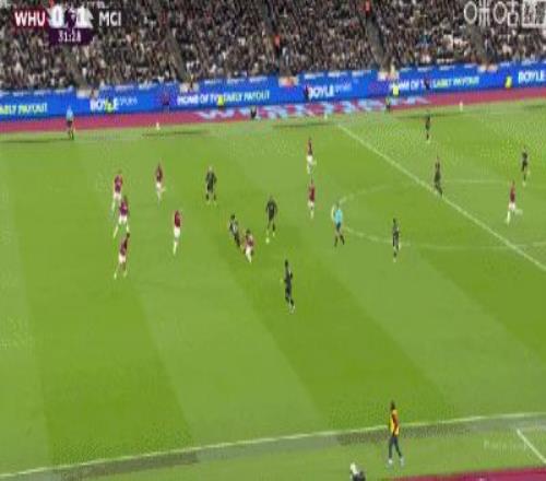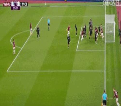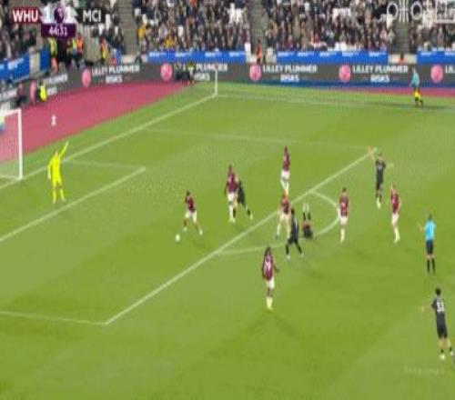 第31分鐘,B席禁區(qū)左路吊射破門,曼城1-0西漢姆聯(lián)