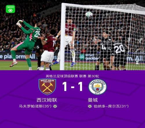 北京時間3月15日英格蘭足球頂級聯(lián)賽 聯(lián)賽 第30輪,西漢姆聯(lián)主場對陣曼城。上半場B席吊射破門,馬夫羅帕諾斯頭球扳平,下半場哈蘭德失良機,賴因德斯中框,最終比分西漢姆聯(lián) 1-1 曼城。