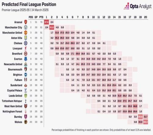 Opta超級計(jì)算機(jī)預(yù)測的最新奪冠概率方面,阿森納奪冠概率高達(dá)97.6%,而曼城的奪冠概率僅為2.43%。