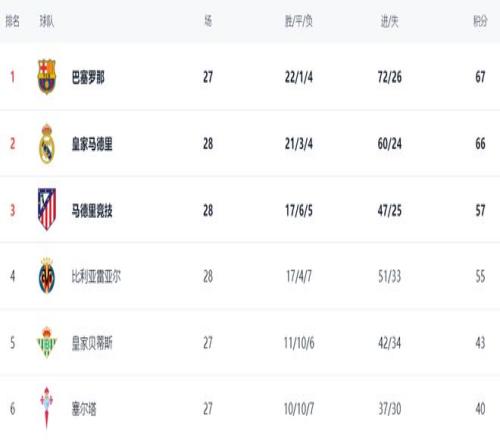 在積分榜上,巴薩依然高居榜首,戰(zhàn)績(jī)是22勝1平4負(fù),拿到67分?;蜀R贏球之后,總積分達(dá)到66分,僅僅落后巴薩1分,屈居第2名。不過,皇馬比巴薩多踢1場(chǎng)。顯然,巴薩還是占據(jù)奪冠主動(dòng)權(quán)。馬競(jìng)贏球之后,總積分達(dá)到57分,排名升到第3。而比利亞雷亞爾以55分排名第4。第5的是皇家貝蒂斯,只拿到43分,想要進(jìn)一步提升排名基本是不可能的事情。