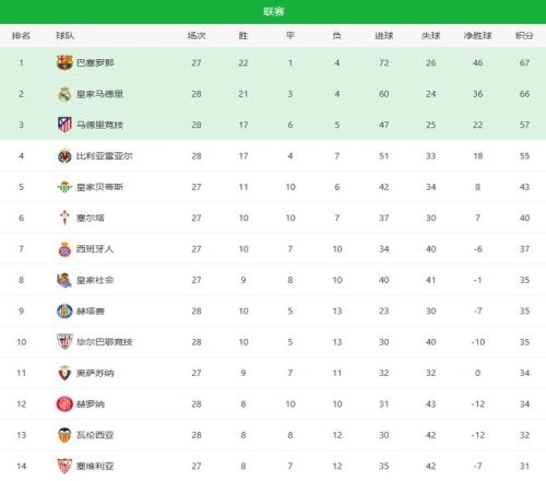 隨著皇馬41大勝+馬競10!西甲最新積分榜:巴薩僅領(lǐng)先1分