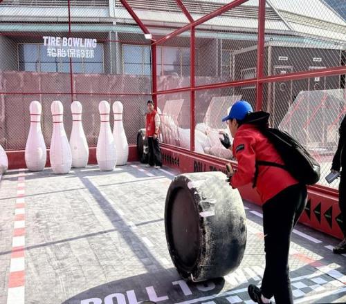 2026年3月11日,上海西岸的格子旗嘉年華設(shè)置了多項趣味游戲。圖為一名女士正在體驗輪胎保齡球。澎湃新聞 實習(xí)生 楊溜 圖