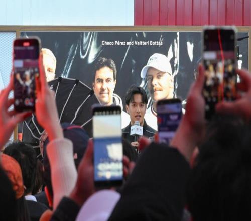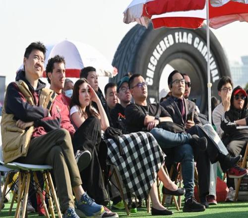 2026年3月13日,上賽場外的格子旗嘉年華廣場上,全球各地的車迷正聚精會神地看著比賽。澎湃新聞記者 吳棟 圖